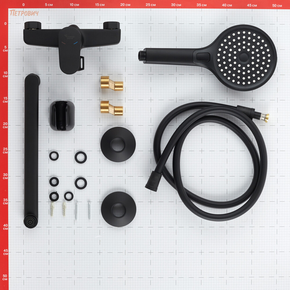 Смеситель, монтажный набор, душевой шланг, ручная лейка, держатель, инструкция по эксплуатации с гарантийным талоном.