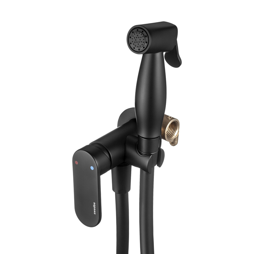 Встраиваемый смеситель с гигиеническим душем Swedbe Platta в черном цвете произведен из латуни. Имеет однорычажный тип управления и защиту от перекручивания шланга.