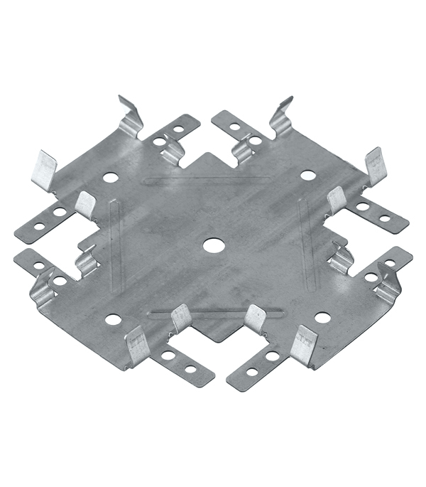 Одноуровневый соединитель «краб» предназначен для крестообразного соединения металлических профилей ПП 60х27 мм. Он изготовлен из высококачественной, устойчивой к коррозии и другим неблагоприятным образованиям оцинкованной стали толщиной 0,9 мм.