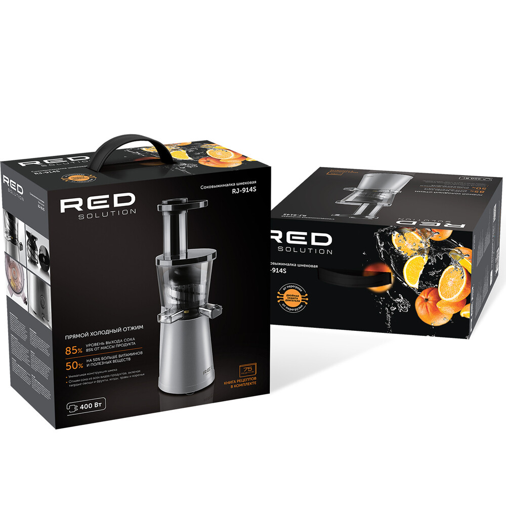 RED solution RJ-914S – универсальная шнековая соковыжималка с системой холодного отжима, которая дает возможность получать до 85% сока от массы продукта на выходе.