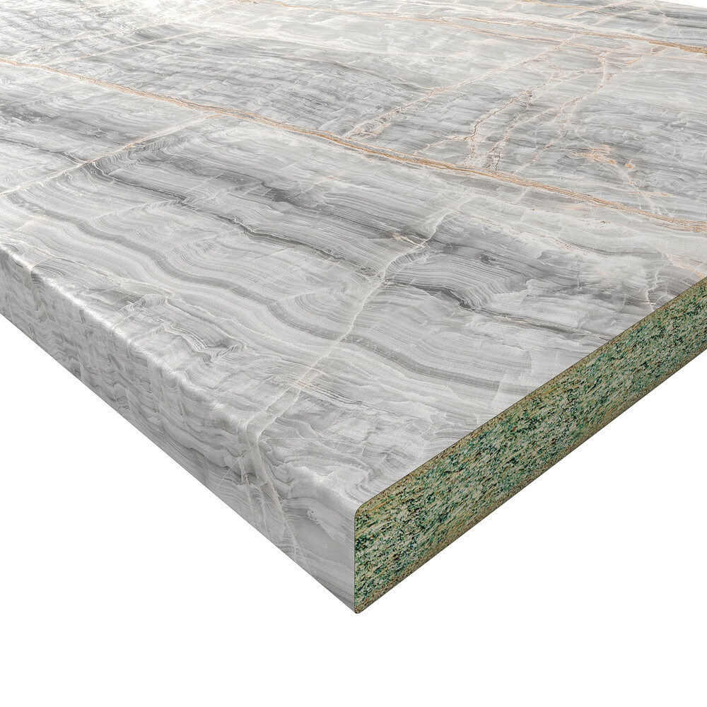 Столешница выполнена с защитным слоем оверлей на влагостойкой плите ДСП, обратная сторона столешницы со специальным покрытием, которое препятствует попаданию влаги и разбуханию. Также столешница оснащена каплесборником. Сочетание технических характеристик даст вам уверенность, что столешница прослужит долгие годы и будет украшать интерьер кухни. Столешница имеет подгиб по длинной лицевой стороне радиусом 3 мм, на тыльную сторону нанесена техническая кромка. Боковые торцы не имеют кромки.