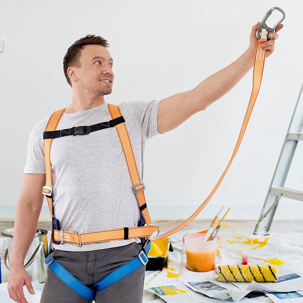 Строп оснащен амортизатором рывка для снижения нагрузки на позвоночник работника в случае возникновения срыва при выполнении высотных работ.