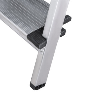В основании стремянки прочная рама из алюминиевого профиля прямоугольного сечения. Пластиковые наконечники препятствуют скольжению, и обеспечивают отличную устойчивость. Многократное клепаное соединение ступеней с рамой обеспечивает исключительную надежность и безопасность при работе на стремянке. Имеет пять ступеней шириной 130 мм, что позволяет стопе комфортно размещаться на лестнице.