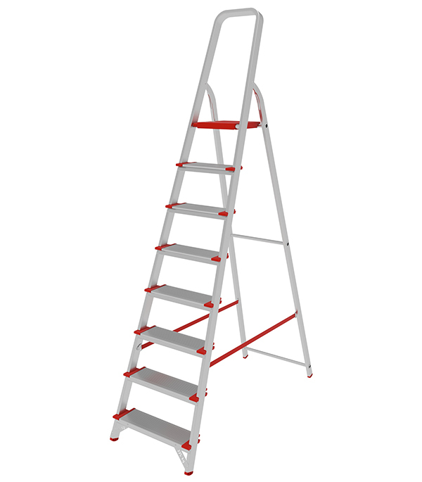 В основании стремянки прочная рама из алюминиевого профиля прямоугольного сечения. Пластиковые наконечники препятствуют скольжению, и обеспечивают отличную устойчивость. Многократное клепаное соединение ступеней с рамой обеспечивает исключительную надежность и безопасность при работе на стремянке. Имеет восемь ступеней шириной 130 мм, что позволяет стопе комфортно размещаться на лестнице.