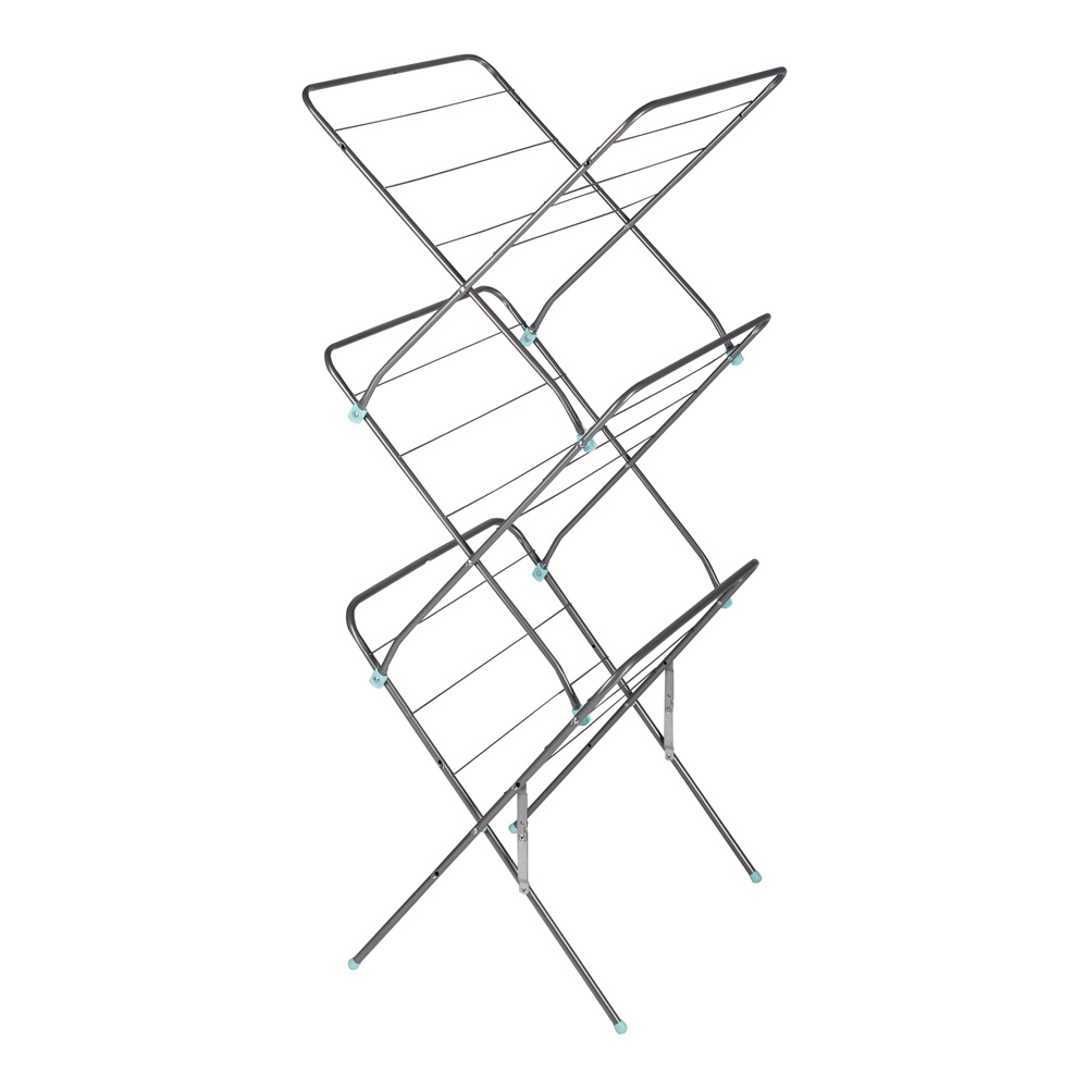 Сушилка для белья напольная вертикальная, складная. Раскладывается в высоту, занимает минимум места. Имеет антискользящие наконечники на опорах.