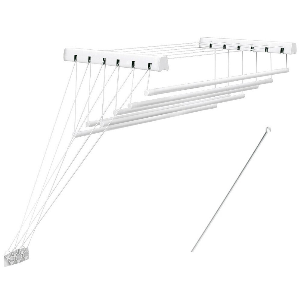 Сушилка для белья с возможностью крепления на стену или к потолку. Оптимальна для использования в ванной комнате или на балконе. Изготовлена из нержавеющей стали с полимерным порошковым покрытием, которое защищает от воздействия влаги и предотвращает механические повреждения. Представляет из себя конструкцию из крепежных кронштейнов, штанг-трубок, на которых развешивается белье, и веревочной системы для фиксирования штанг на двух разных положениях — на высоте комфортной для развешивания белья и на высоте для сушки белья. Суммарная длина поверхности для размещения белья — 8,4 м. Максимальная нагрузка — 12 кг.