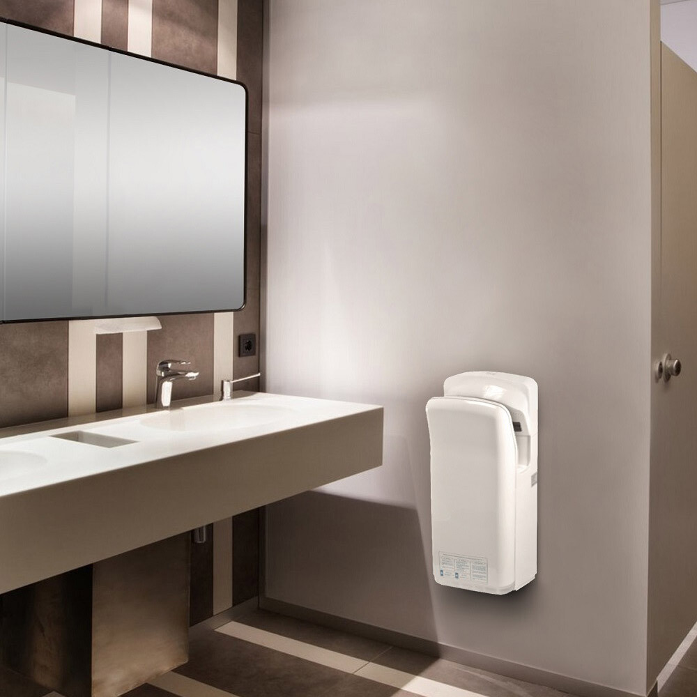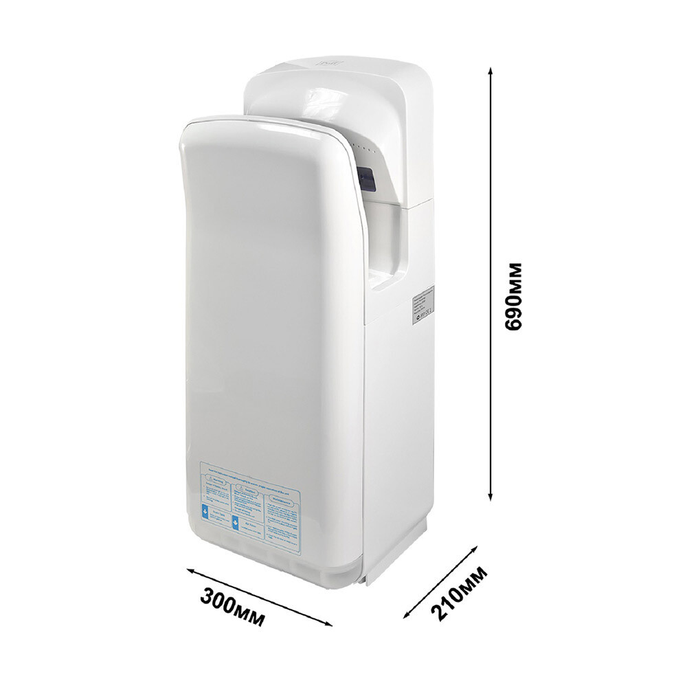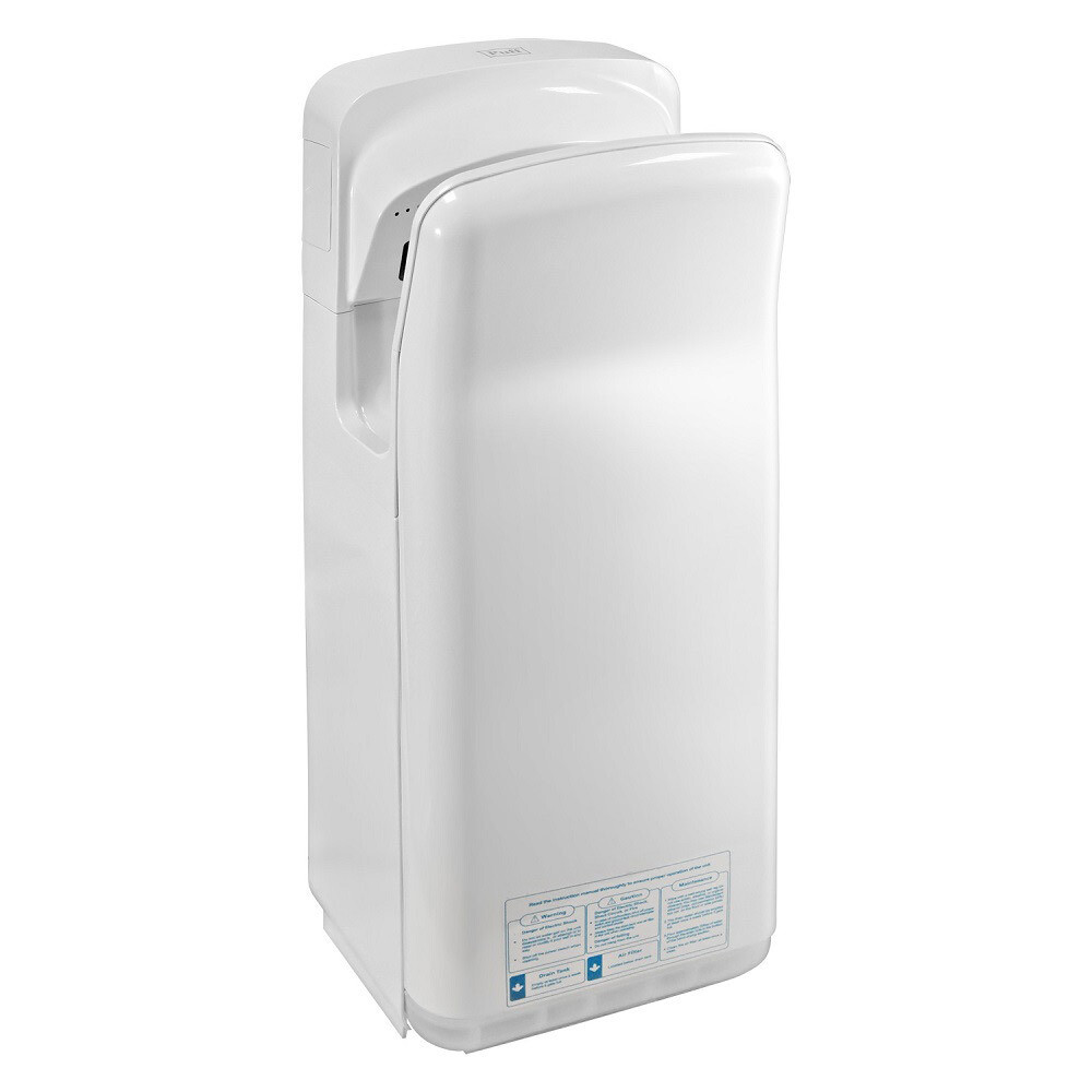Электросушитель для рук. Осушение рук осуществляется за счет двух узконаправленных быстрых потоков воздуха. При использовании такого типа электрополотенца, сушка рук занимает от 5 до 7 секунд. Данная модель снабжена переключателем холодный-горячий, что дает возможность использовать холодный воздух (при мощности устройства 900 Вт) или горячий воздух (при мощности устройства в 2000 Вт). Влага с рук собирается в каплесборнике объемом 0.5 л, которую периодически необходимо опустошать (это не требует специальных навыков).