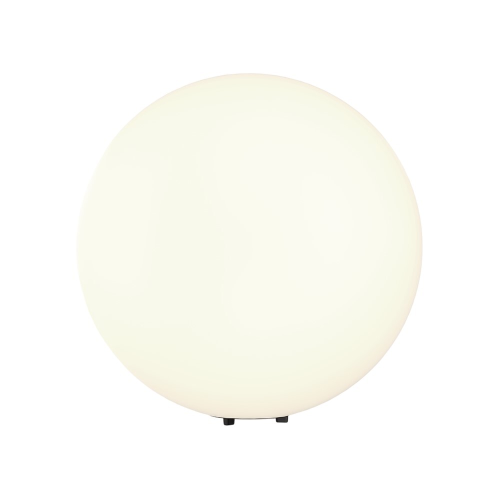 Наземный светильник в форме шара исполнен в белом цвете из пластика. Модель подходит для размещения на полу в саду в современном стиле.