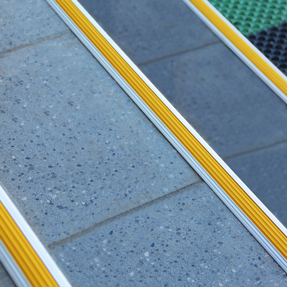 Тактильная лента в алюминиевом профиле — это антискользящая накладка/порог для входных групп и ступеней. Накладка монтируется на клей или саморезы.