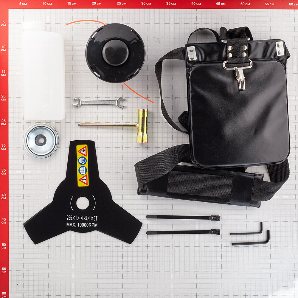 Триммер – 1 шт.; Ремень подвесной – 1 шт.; Кожух защитный с фартуком – 1 шт.; Головка триммерная – 1 шт.; Нож для жесткой травы – 1 шт.; Рукоятка правая в сборе – 1 шт.; Рукоятка левая – 1 шт.; Ключ комбинированный – 1 шт.; Ключ рожковый 8 х 10 мм – 1 шт.; Ключ шестигранный 5 мм – 1 шт.; Ключ шестигранный 4 мм – 1 шт.; Хомут пластиковый – 2 шт.; Емкость для топлива – 1 шт.; Руководство по эксплуатации – 1 шт.
