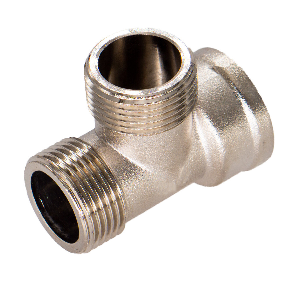 Тройник 1/2″ г/ш/ш CTM с внутренней/наружной/наружной резьбой — трехсторонний резьбовой фитинг. Предназначается для соединения частей трубопровода. Тройник изготавливается из высококачественной горячепрессованной латуни. Никелированное покрытие тройника дает дополнительный запас прочности. Никелирование предотвращает появление коррозии, а также защищает от механического износа и вредного воздействия агрессивных жидкостей и воздушно-газовых сред. Резьба тройника нарезается на станке с ЧПУ. Наружная резьба тройника оснащена насечками, обеспечивающими лучшее сцепление с уплотнительным материалом при монтаже.