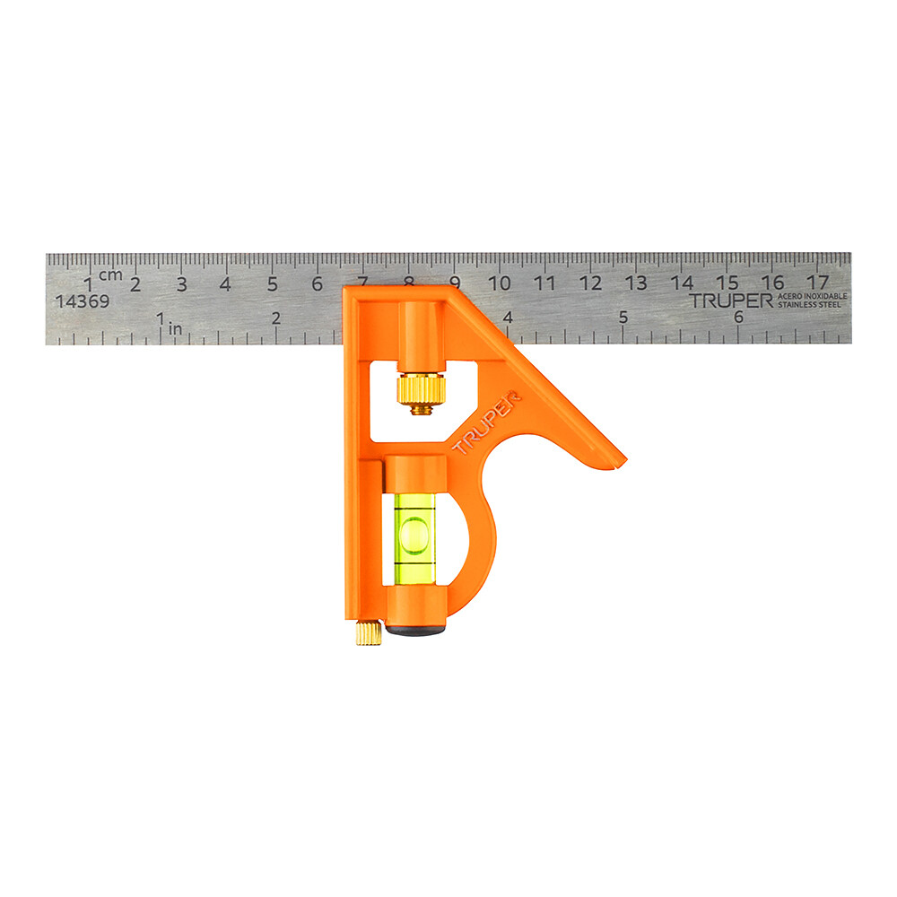 Встроенный уровень, чертилка, углы 90 и 45, полотно из нержавеющей стали с гравировкой метрической и дюймовой шкалы, корпус из алюминия.