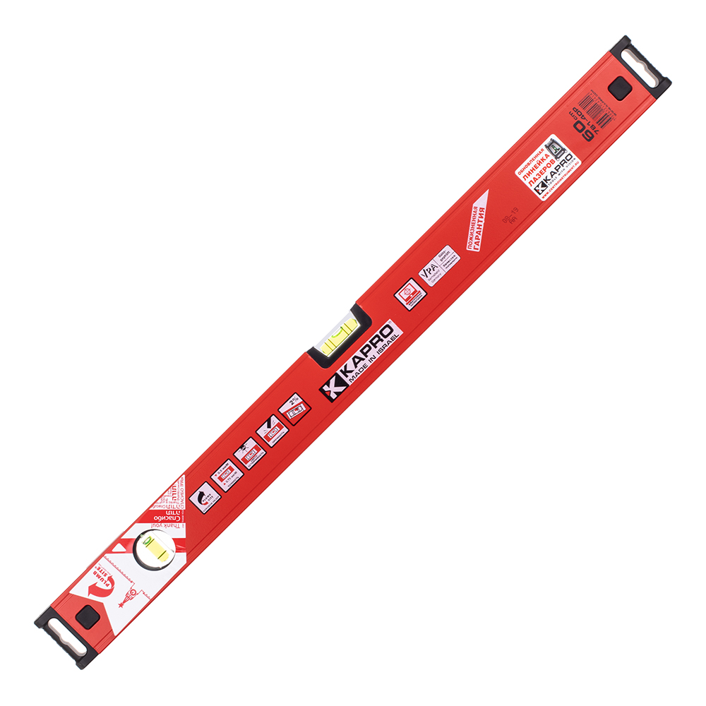 Уровень Kapro используется для строительных и отделочных работ. Предназначение данного прибора — определение отклонений поверхностей и различных конструкций от горизонтали или вертикали. Все уровни бренда Kapro имеют высокую точность и надежность. Легкий и прочный алюминиевый корпус с ребрами жесткости и фрезерованной рабочей поверхностью обеспечивает долгий срок службы. Резиновые выносные элементы торцевых заглушек, выполняют противоскользящую функцию на гладких поверхностях (металл, стекло, кафель). Запатентованная технология нанесения разметки (линий) внутри колбы — гарантия точности показаний. Так же имеются дополнительные риски, что обеспечивает измерение уклона в 2%. С запатентованной системой Plumb Site® Dual-View™ в конструкции уровня можно удобно и быстро проверить вертикальные отклонения: достаточно одного взгляда в прямой смотровой паз. Надежное крепление колб на эпоксидную смолу, а сами колбы выполнены из полиакрила устойчивы к ультрафиолетовым лучам. Материал колб устойчив к механическим воздействиям и растрескиванию при случайных падениях. Все уровни бренда Kapro проходят электронное тестирование колб и электронную калибровку точности.