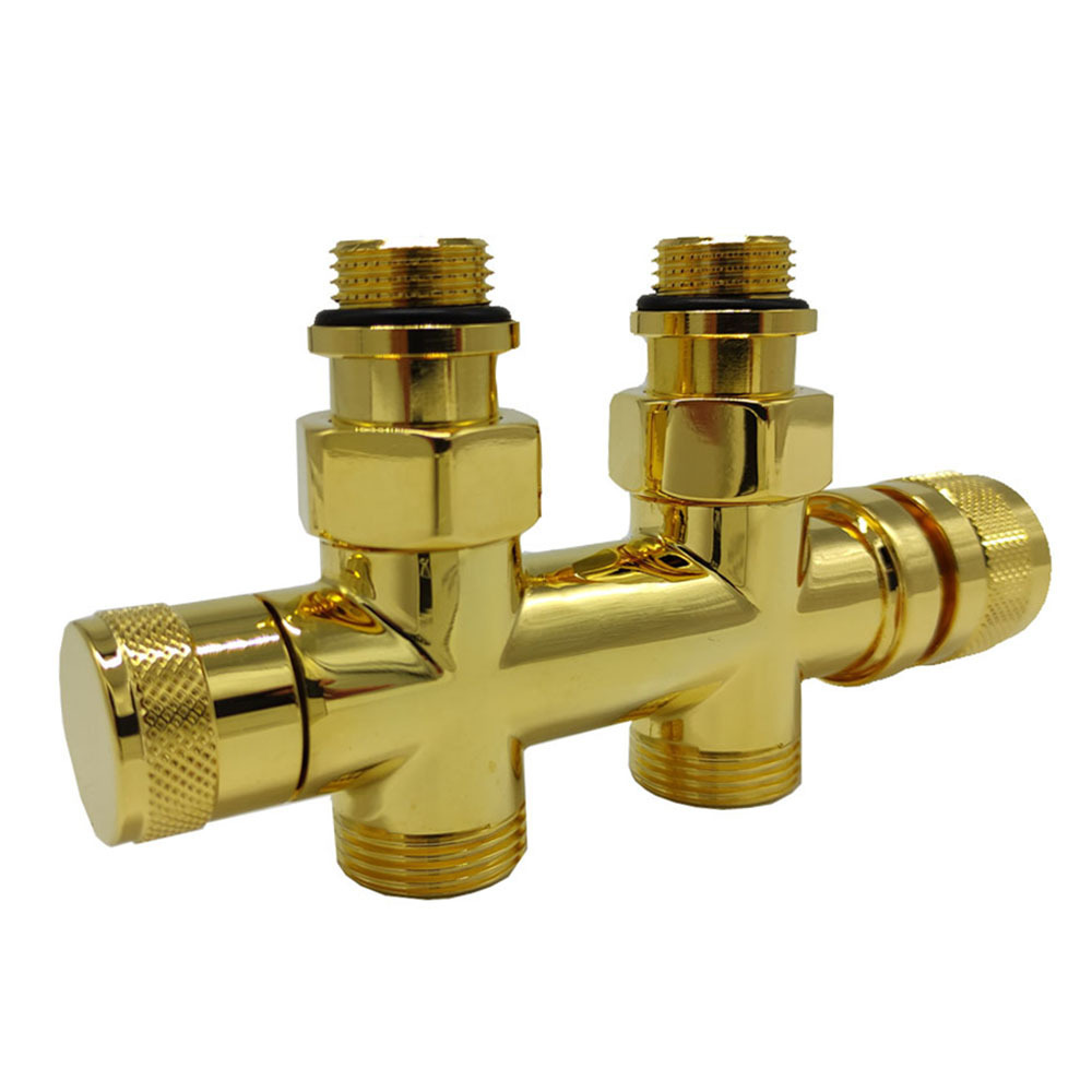 Узел SR Rubinetterie прямой для нижнего подключения радиаторов — вентиль на подачу ручной регулировки, преобразуемый в термостатический, с механизмом предварительной настройки и запорный клапан. Межосевое расстояние 50 мм, соединение для медных или многослойных труб, резьбовые переходники для подключения к радиатору с герметичной прокладкой.