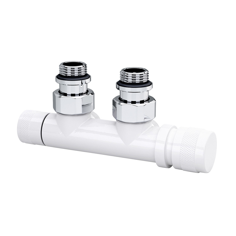 Узел SR Rubinetterie угловой для нижнего подключения радиаторов — вентиль на подачу ручной регулировки, преобразуемый в термостатический, с механизмом предварительной настройки и запорный клапан. Межосевое расстояние 50 мм, соединение для медных или многослойных труб, резьбовые переходники для подключения к радиатору с герметичной прокладкой.
