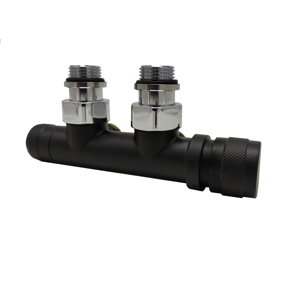 Узел SR Rubinetterie угловой для нижнего подключения радиаторов — вентиль на подачу ручной регулировки, преобразуемый в термостатический, с механизмом предварительной настройки и запорный клапан. Межосевое расстояние 50 мм, соединение для медных или многослойных труб, резьбовые переходники для подключения к радиатору с герметичной прокладкой.
