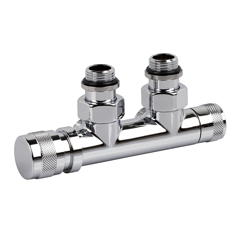 Узел SR Rubinetterie угловой для нижнего подключения радиаторов — вентиль на подачу ручной регулировки, преобразуемый в термостатический, с механизмом предварительной настройки и запорный клапан. Межосевое расстояние 50 мм, соединение для медных или многослойных труб, резьбовые переходники для подключения к радиатору с герметичной прокладкой.