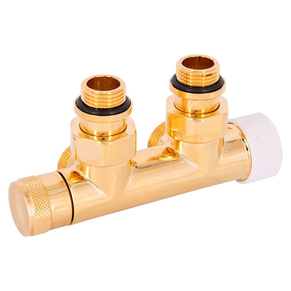 Узел SR Rubinetterie угловой для нижнего подключения радиаторов — вентиль на подачу термостатический, с механизмом предварительной настройки и запорный клапан. Межосевое расстояние 50мм, соединение для медных труб или многослойных труб, резьбовые переходники для подключения к радиатору с герметичной прокладкой.