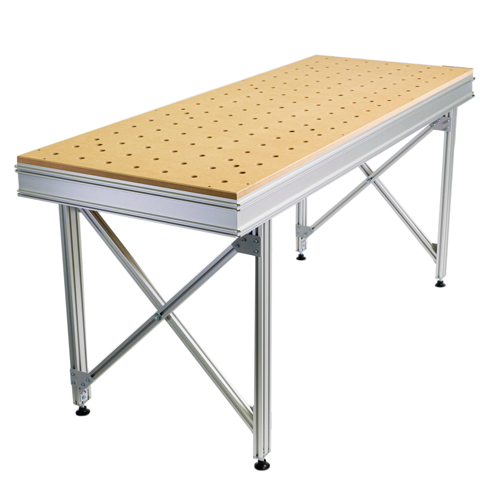 Каркас стола сделан из прочного анодированного алюминиевого профиля. Пазы профиля рассчитаны под болт M8 и под крепления струбцинами заготовок на торце стола или на самой столешнице. Ноги-опоры регулируются по высоте и компенсируют неровности пола для работ в любом месте.