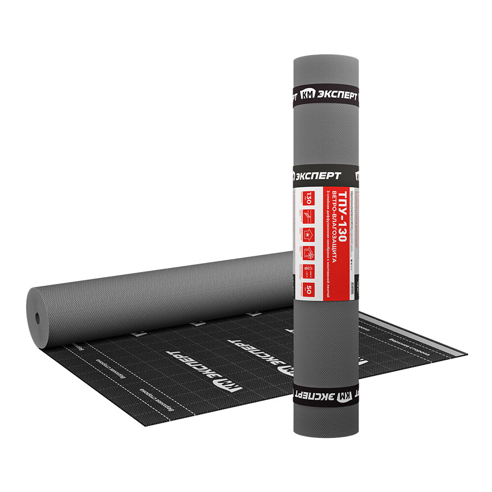 Ветро-влагозащита КМ ЭКСПЕРТ ТПУ-130 — это трехслойная диффузионная мембрана с функциональным слоем из паропроницаемого покрытия — термопластичного полиуретана (ТПУ), защищенного с двух сторон полотном из нетканого полипропилена. По полотну рулона через каждые 10 см нанесена разметка, которая облегчает раскрой мембраны и снижает количество обрезков материала. Одностороння клеящаяся лента, установленная на мембране, облегчает фиксацию во время монтажа.