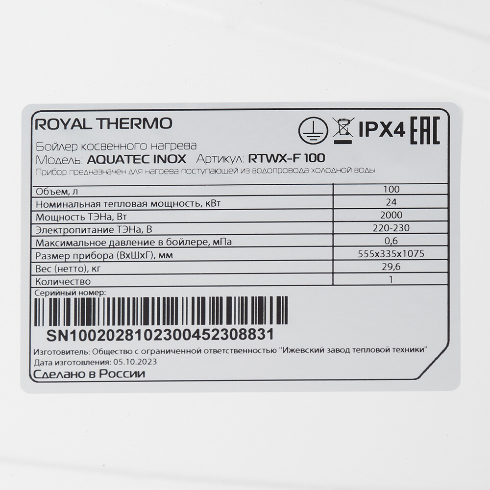 Водонагреватель накопительный Royal Thermo Aquatec Inox RTWX-F 100 косвенного нагрева 100 л 24 кВт универсальный