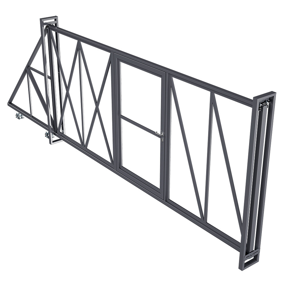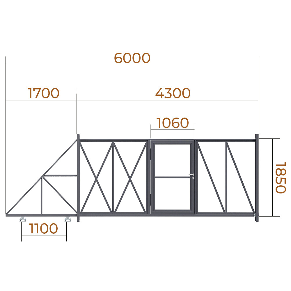 Каркас откатных ворот с калиткой предназначен для самостоятельного заполнения профлистом, металлическим штакетником, сеткой 3D и подходит для установки автоматики.