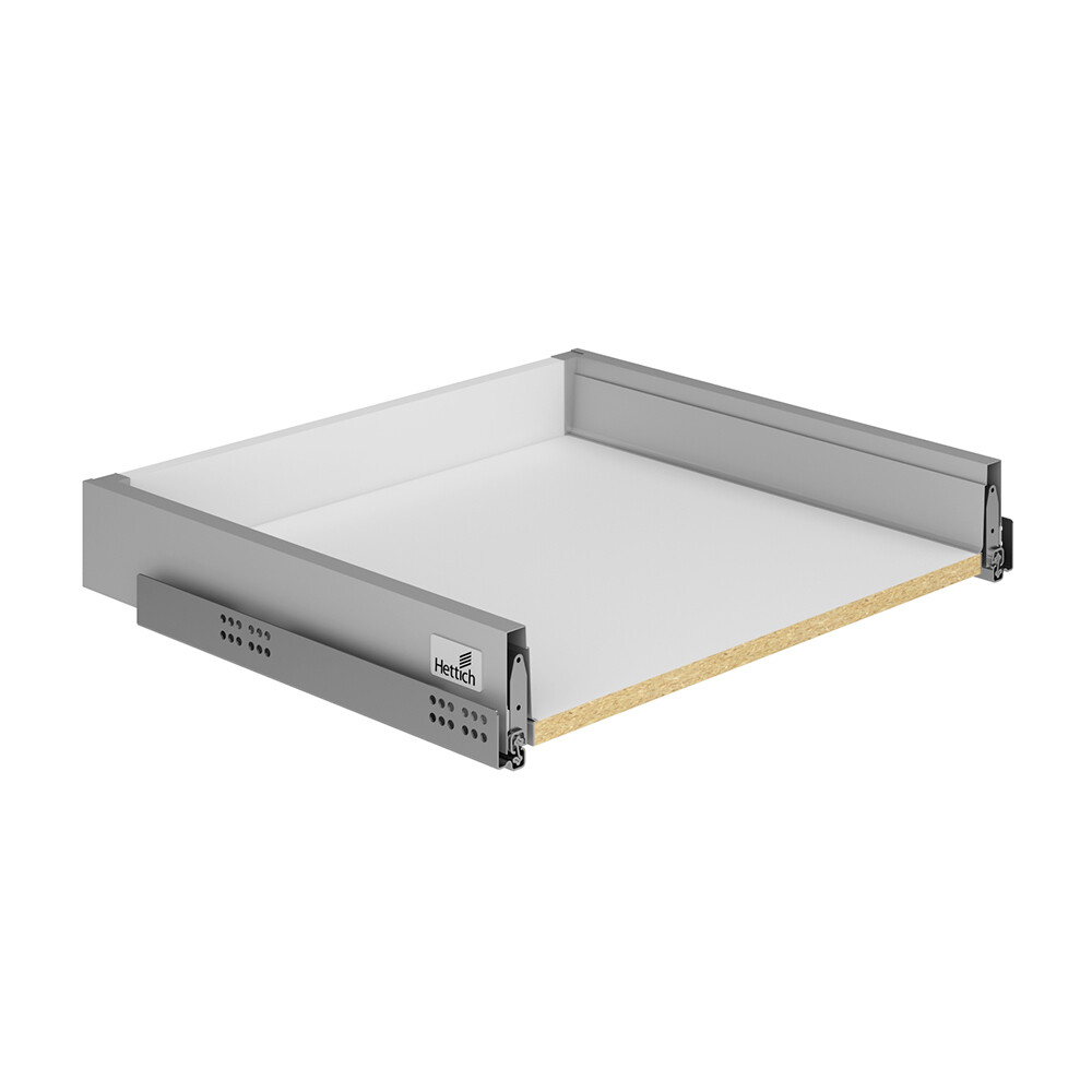 Универсальная система InnoTech — дизайн и функциональность системы, основанной на единой платформе, невероятно точно подстраивается под ваши требования. В основе ящиков стальные боковины с лакированным порошковым покрытием серебристого цвета. Дно и задняя стенка ящика выполнены из ЛДСП белого цвета. Комплект выдвижного ящика Hettich Innotech на направляющих частичного выдвижения. Ящик подходит к кухонному шкафу напольному Иннотех 60х72х56 см, код 1081093.