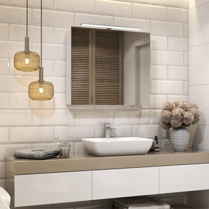 зеркальный шкаф в сборе, навес врезной 35х12 с регулировкой – 2 шт., дюбель 8х50 – 2 шт., саморез 5,5х60 – 2 шт., светодиодный светильник.