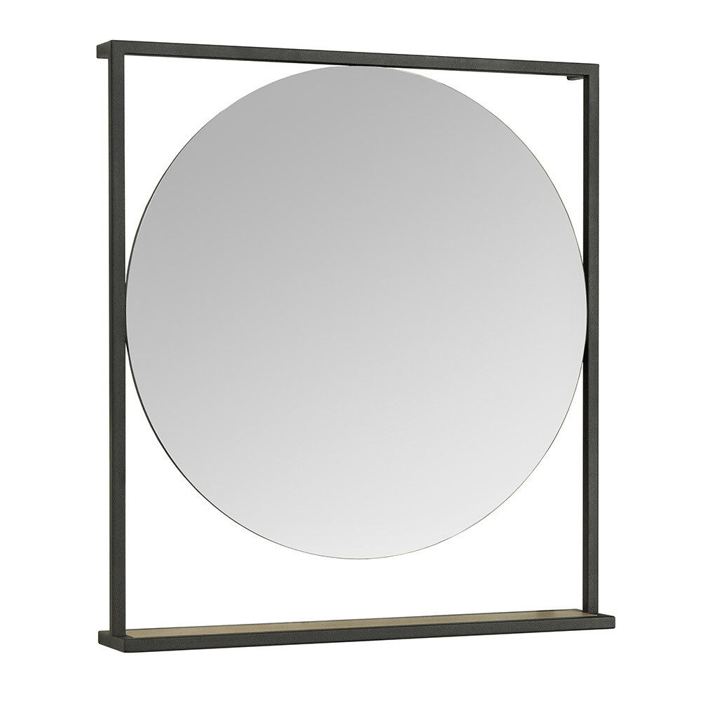 Зеркало Лофт Фабрик отличается необычным оригинальным дизайном и удобным функционалом. Черные металлические профили в форме прямоугольника обрамляют круглое зеркало, под которым находится полочка из влагостойкой ламинированной плиты в цвете Дуб Эндгрейн. Открытая полочка удобна для косметических и декоративных мелочей, которые всегда должны быть под рукой.
