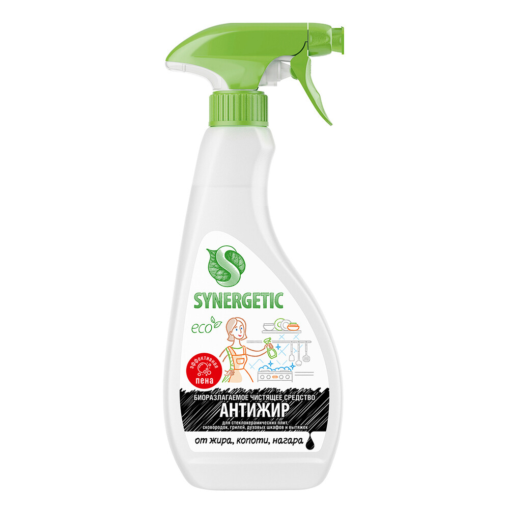 Высокоэффективное чистящее средство «Антижир» Synergetic с усиленной формулой предназначено для уборки кухонных поверхностей от стойких жировых загрязнений, копоти, нагара, масляных пятен и накипи. Предназначено для стеклокерамических, металлических, эмалированных плит и поверхностей, сковородок, противней, кастрюль, шампуров, решеток-гриль, пароконвектоматов, микроволновок, вытяжек, духовых шкафов, каменных столешниц, керамической плитки и других кухонных поверхностей. Эффективная стойкая пена отлично распределяется по поверхности и обеспечивает быстрое удаление въевшегося и пригоревшего жира, не оставляя царапин. Обладает свежим цитрусовым ароматом благодаря гипоаллергенной парфюмерной композиции с эфирными маслами мандарина, лемонграсса, лимона, апельсина и перечной мяты. Средство устраняет неприятные запахи, эффективно даже в холодной воде, полностью смывается, не оставляя разводов.