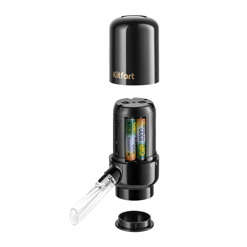 Пользоваться КТ-4042 просто – наденьте его на бутылку, а для подачи вина в бокал – нажмите и удерживайте кнопку сверху. Для данной модели важно, чтобы корпус плотно прилегал к горлышку бутылки. Для этого предусмотрено уплотнительное кольцо в месте крепления аэратора на горлышке бутылки. Работает от 4-х батареек. Батарейки в комплект не входят. Во время работы аэратора включается подсветка трубки.