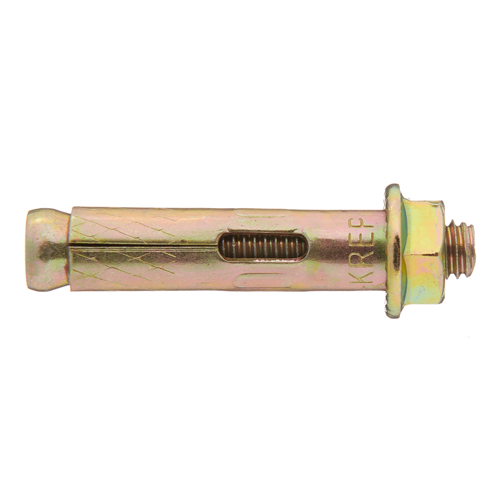 Оцинкованное покрытие обеспечит защиту от коррозии. Анкерный болт с гайкой (втулочный анкер) оснащен фиксирующей гильзой, длина которой равна размерам стального стержня. На хвостовой части шпильки выполнена клинообразная головка. При завинчивании гайки она смещается по резьбовой части. В результате перемещения происходит распирание втулки. Конструктивные особенности такого вида крепежа позволяют использовать его в легких видах бетонов с ячеистой структурой, а также в кирпиче, изготовленном из обожженной глины.