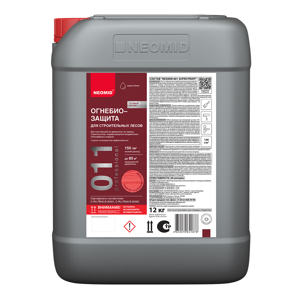 Пропитка огнебиозащитная водостойкая предназначена для защиты строительных лесов, конструкций из древесины на период строительства, подвергающихся воздействию атмосферных осадков, которые после окончания строительства не предназначены для декоративной отделки. Переводит древесину в трудновоспламеняемый и трудногорючий материал, обеспечивает I (первую) группу огнезащитной эффективности древесины и материалов на ее основе при расходе 150 г/м2 согласно ГОСТ Р 53292. Срок сохранения огнезащитной эффективности в условиях отсутствия вымывания – до 7 лет, биозащитного эффекта – до 10 лет.
