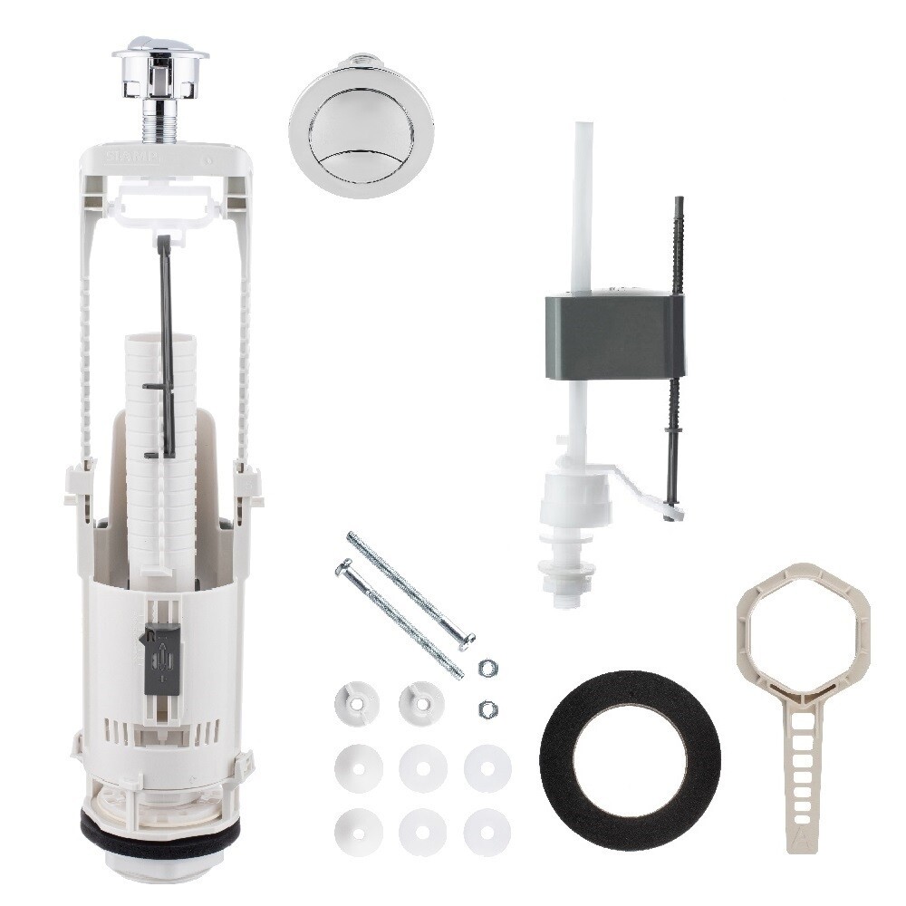 Комплектация: Клапан выпускной — 1 шт., кнопка смыва — 1 шт., клапан наполнительный — 1 шт., прокладка между бачком и унитазом — 1 шт., монтажный комплект — 1 шт., инструкция — 1 шт.