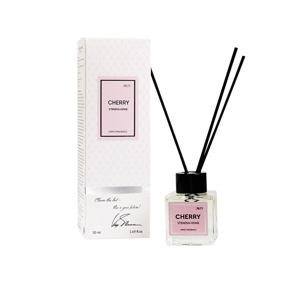 Аромат для дома №53 Cherry — гурманский, вишневый, соблазнительный, пряный и густой, с теплыми древесными нотками и сочным вареньем из лепестков роз. В каждой упаковке находится комплект из 8-ми палочек из микрофибры и сам флакон, наполненный ароматической композицией.
