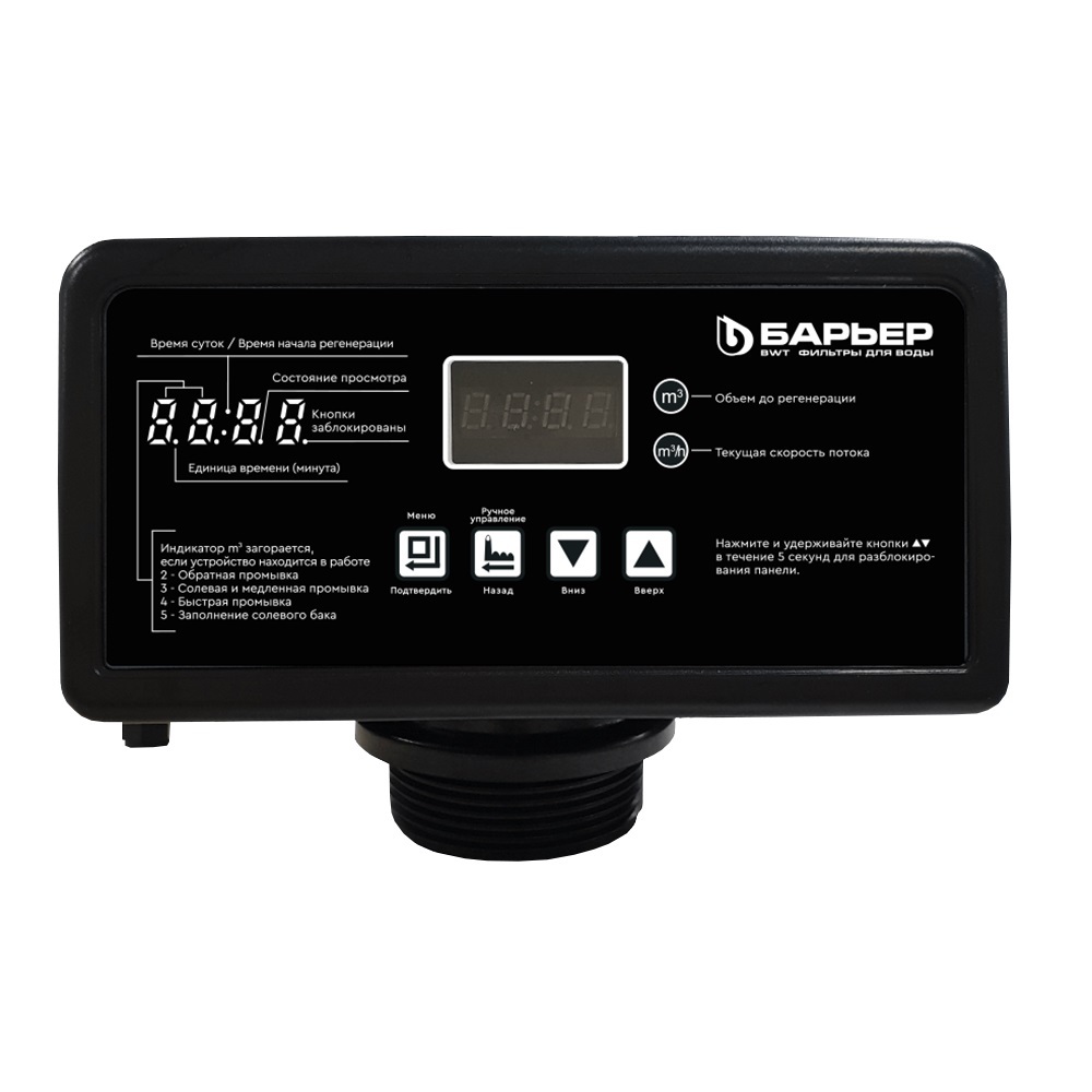 Блок управления осуществляет регенерацию засыпки при исчерпании ее ресурса. Регенерация настраивается через меню блока по дням и по объему очищенной воды. Отсчет происходит благодаря встроенному датчику расхода воды.