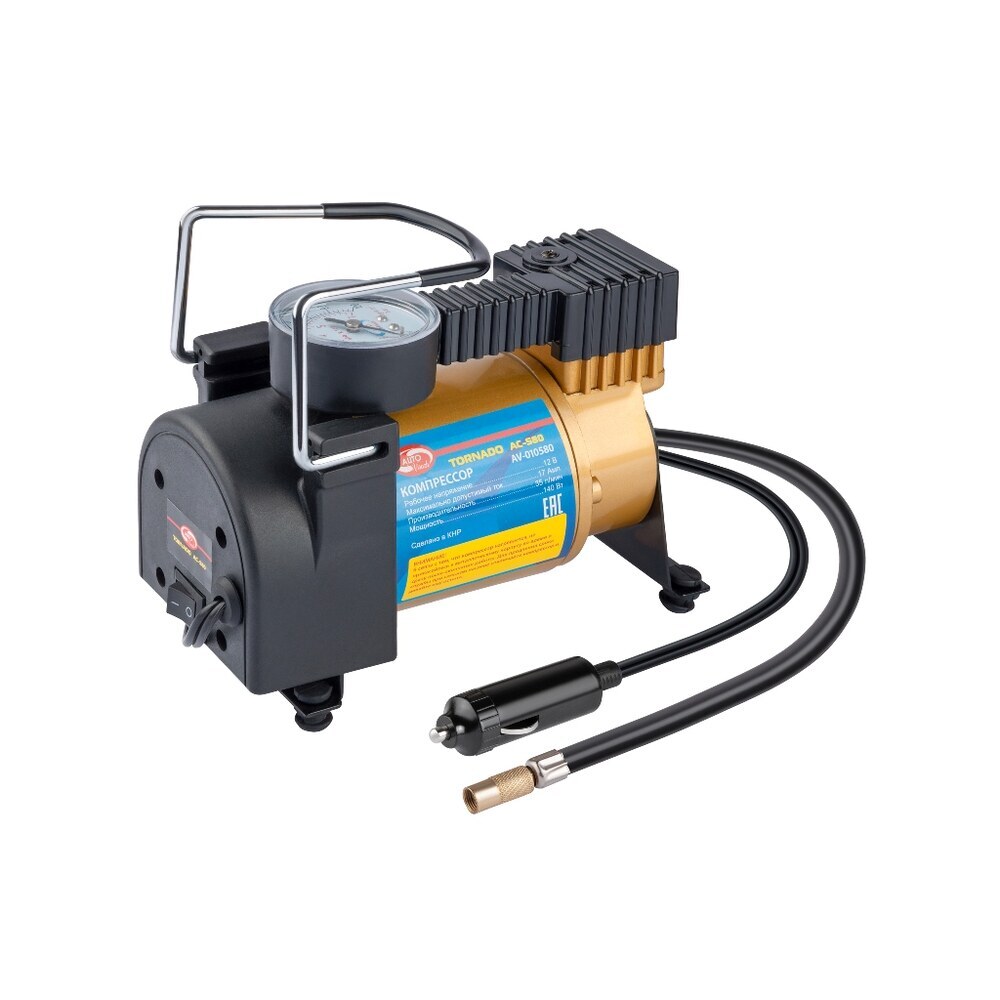 Одноцилиндровый компрессор с функцией автостоп, Autovirazh Tornado AC-580, в комплектации предусмотрен набор универсальных переходников для велосипедных шин, лодок, матрасов, мячей и детских надувных игрушек.