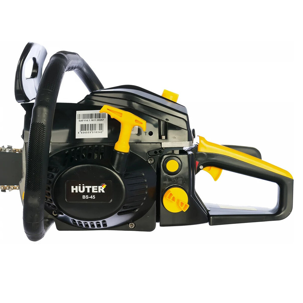 Бензопила Huter BS-45 справится с валкой невысоких деревьев и заготовкой дров, работой с пиломатериалами во время строительства. Прибор оснащен компактной 450-миллиметровой шиной и цепью с толщиной звена 1,5 мм. Количество звеньев составляет 72 шт. с шагом 0,325″, что обеспечивает низкую «агрессивность» при распиле и легкость управления. Инструмент оснащен мощным бензиновым двигателем 3,1 л.с. с объемом 45 см³. Huter BS-45 может работать длительное время за счет вместительного топливного бака 550 мл, для заправки которого необходима смесь на основе бензина и полусинтетического масла для двухтактных двигателей.