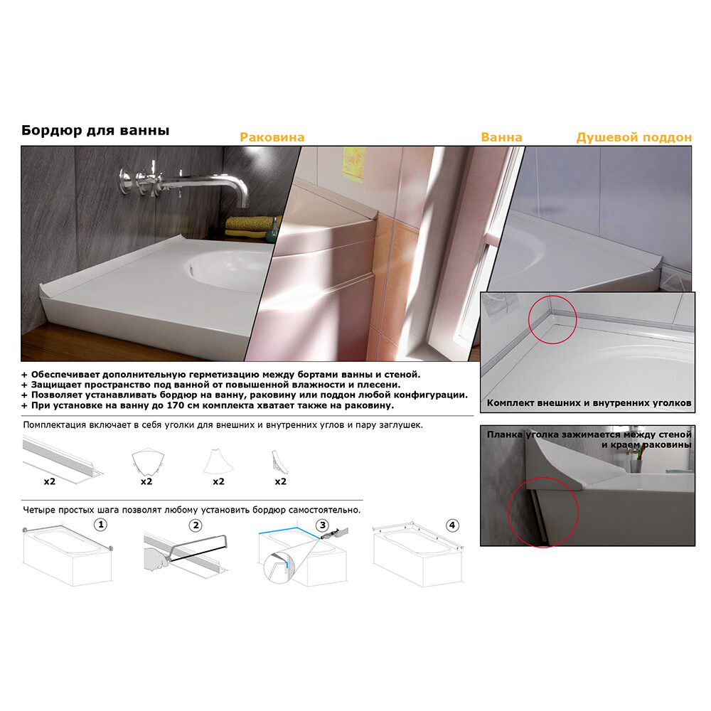 Бордюр идеально подходит как для ванн и поддонов, так и для кухонных столешниц. Обеспечивает дополнительную герметизацию между бортами ванны и стеной. Предупреждает попадание воды в стыки и защищает пространство под ванной от повышенной влажности и плесени.