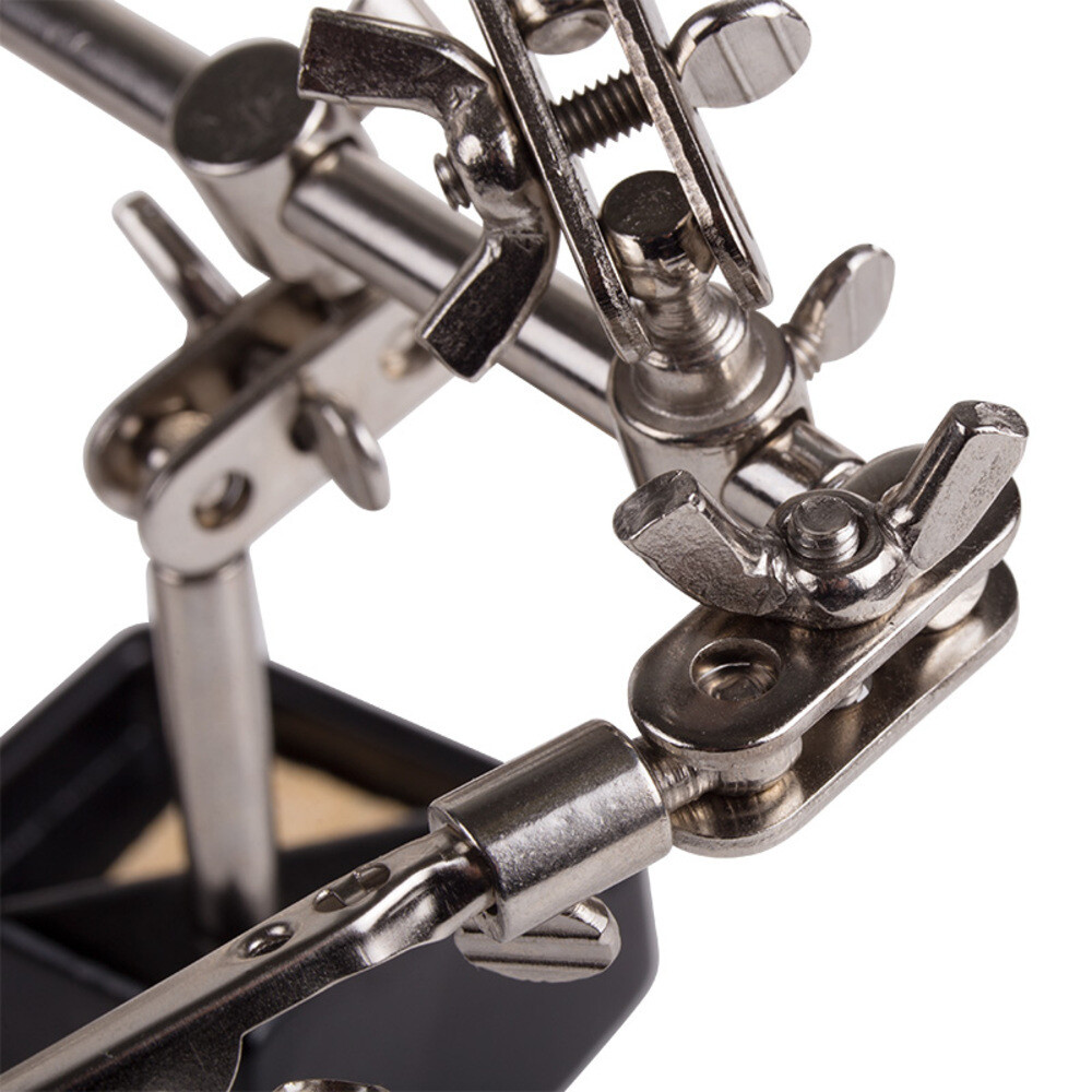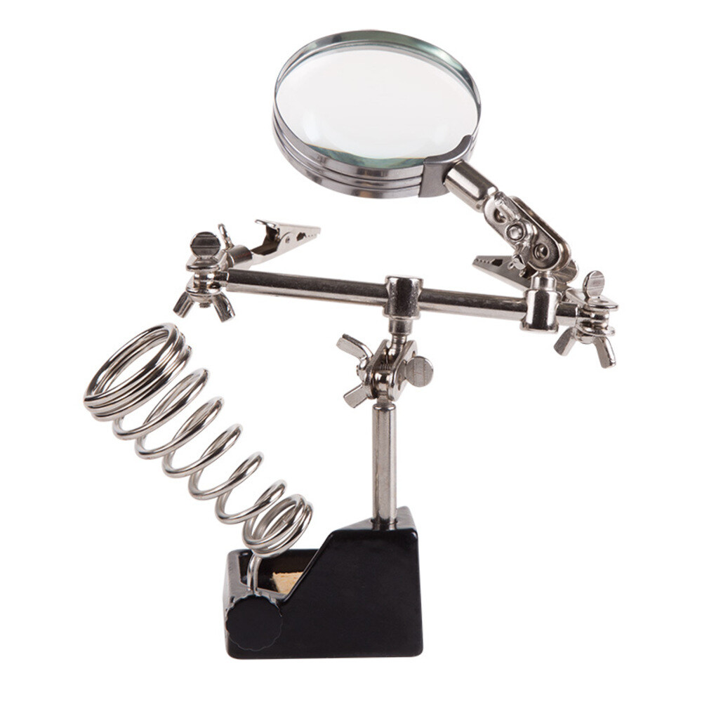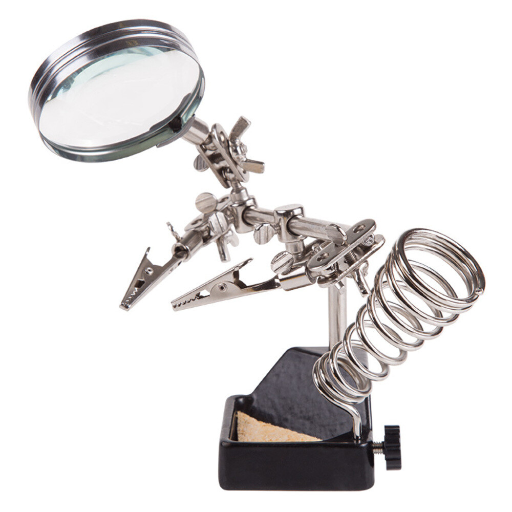 Держатель «третья рука» с лупой х2.5 служит главным образом при проведении паяльно-сборочных работ в электронике, ювелирном деле, сборке и ремонте для зажима мелких деталей в любом нужном положении, когда не хватает двух рук. Инструмент состоит из чугунного основания (тяжелая подставка с нишей для губки, мелких деталей или припоя), шарнирного соединения с зажимами типа «крокодил» (подвижных во всех плоскостях) с никелевым покрытием, лупы с 2.5-кратным увеличением (возможность регулировки положения, диаметр линзы 60 мм) и спиралевидной подставки под паяльник. С помощью лупы можно будет рассмотреть даже самые мелкие детали.