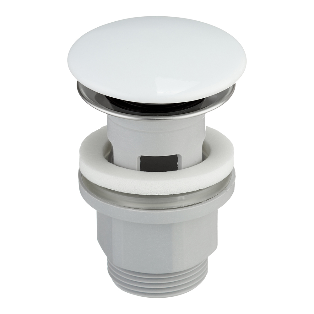 С отверстием для подключения перелива, позволяющего выпускать воду из раковины при ее переполнении через отверстие в нижней части перелива. Система клик-клак — управляется нажатием на пробку слива. Покрытие устойчиво к коррозии, появлению царапин, сколов и потускнению. Круглая заглушка в цвете хром.