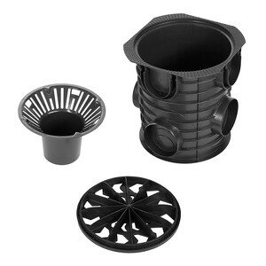 круглый дождесборник, пластиковая решетка и мусоросборная корзина.
