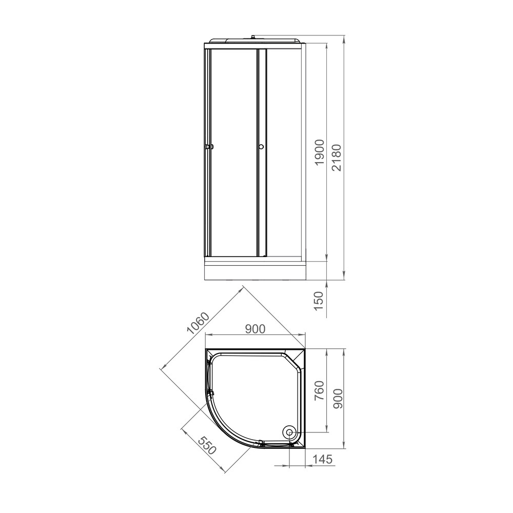 Поддон акриловый в комплекте с каркасом и экраном, комплект стекол, комплект стенок, крыша, верхний тропический душ, ручная лейка, держатель ручной лейки с регулировкой наклона, смеситель с металлическим ручками, полочка для мыльных принадлежносте…