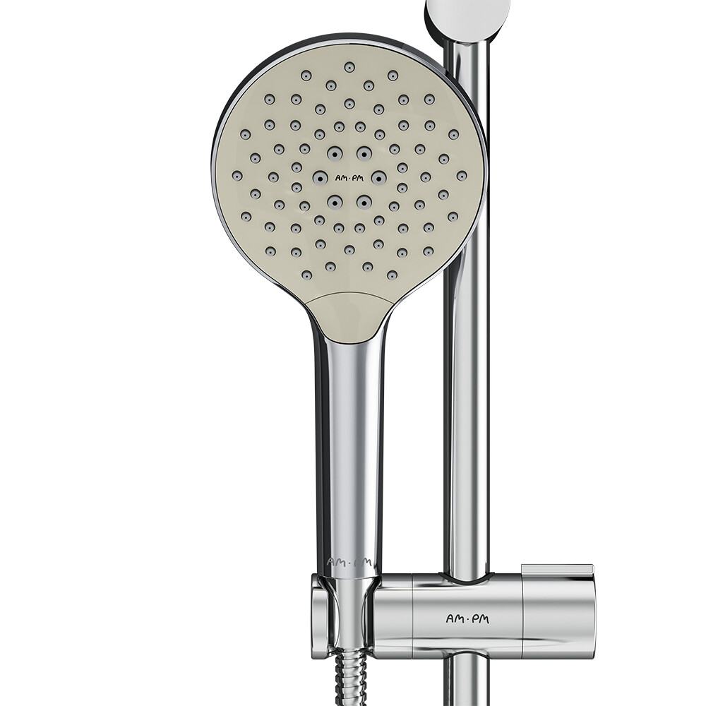 Душевой гарнитур AM.PM имеет трендовый дизайн и уникальный рисунок форсунок, который обеспечивает равномерное распределение воды при любом напоре.