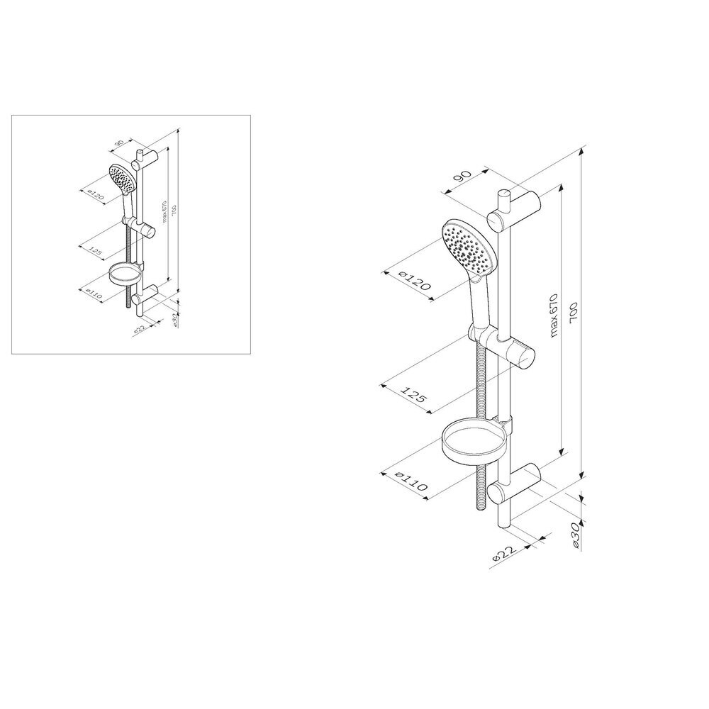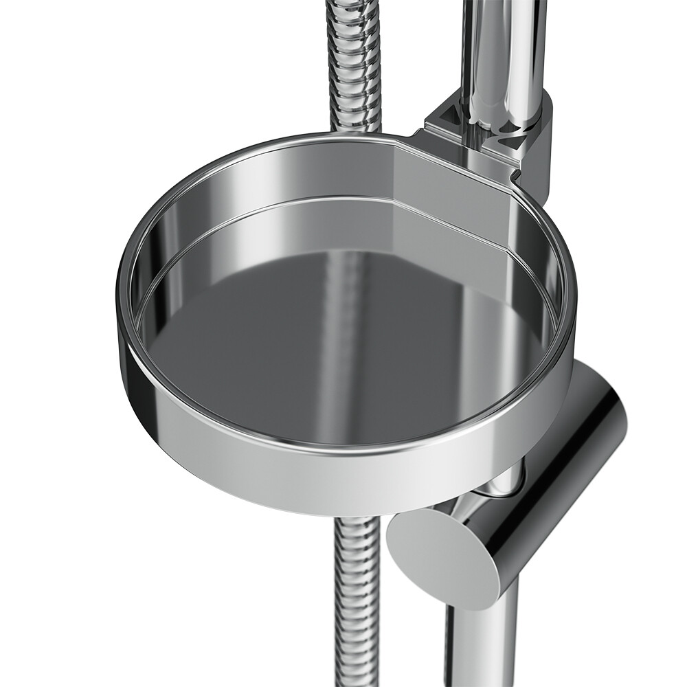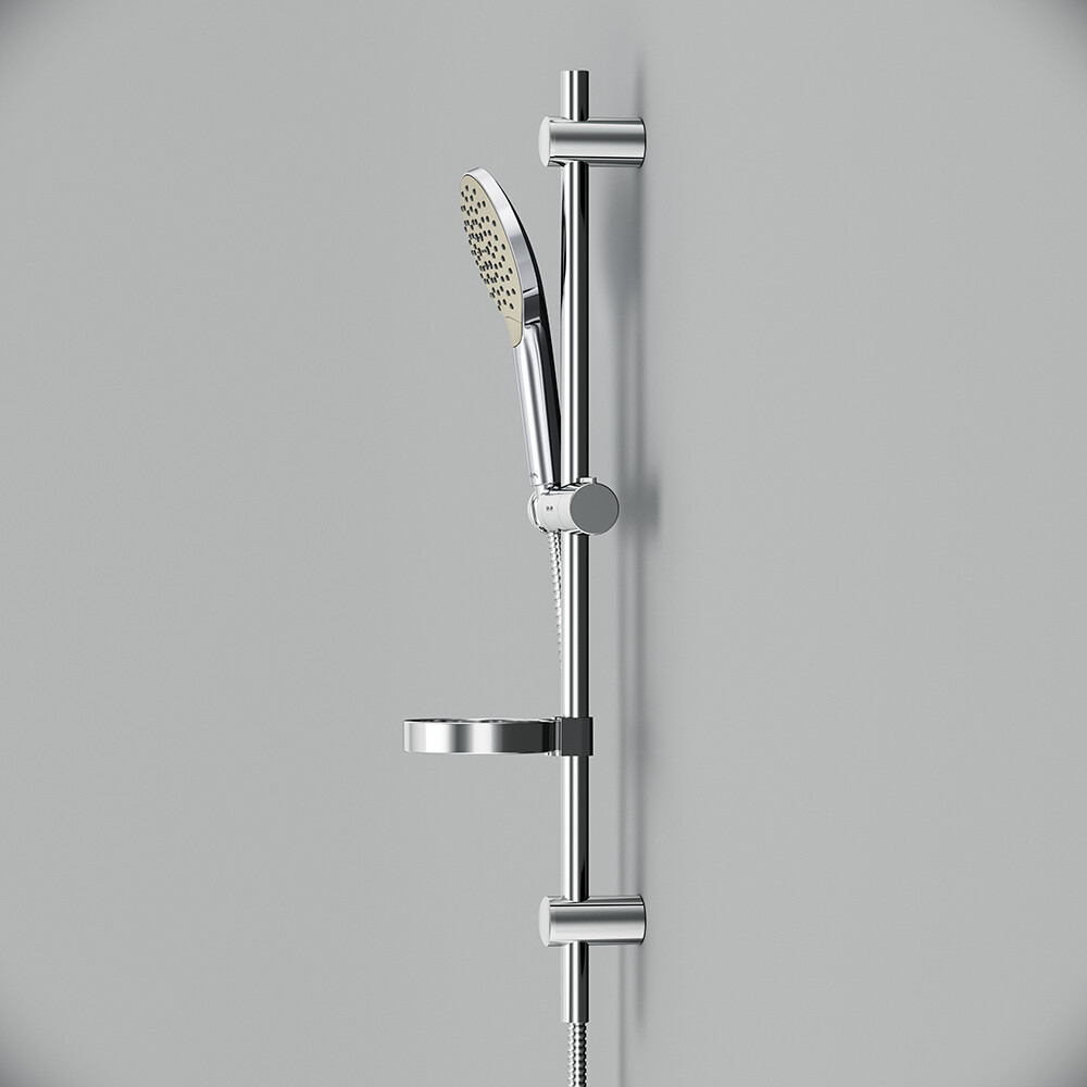 Штанга, душевая лейка, держатель лейки, шланг, мыльница, набор креплений, инструкция.