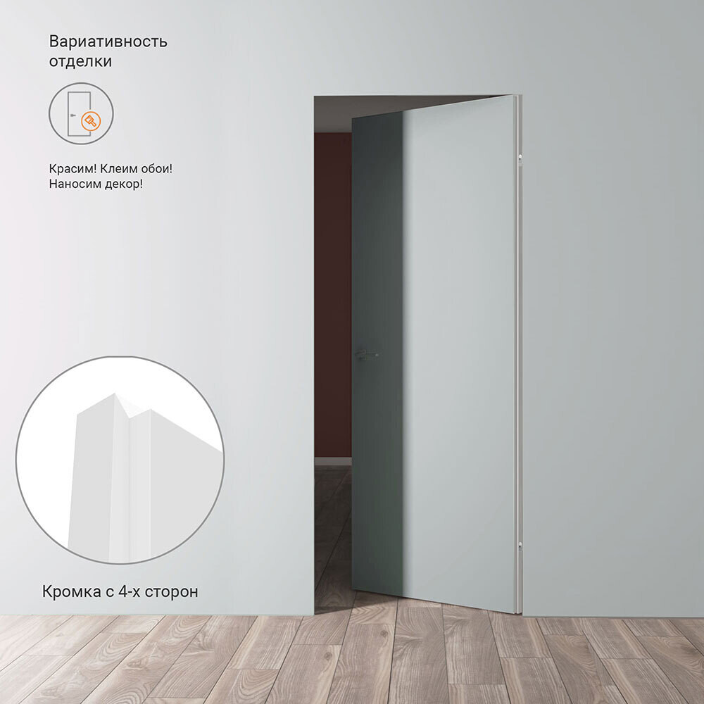 Каркас двери выполнен из сращенного бруска массива сосны, обеспечивающего усиление жесткости полотна. Полотно скрытое, грунтованное, под покраску. Дверь может быть покрашена, оклеена обоями. Кромка ABC с 4-х торцов. В полотно установлен бесшумный магнитный замок Morelli.