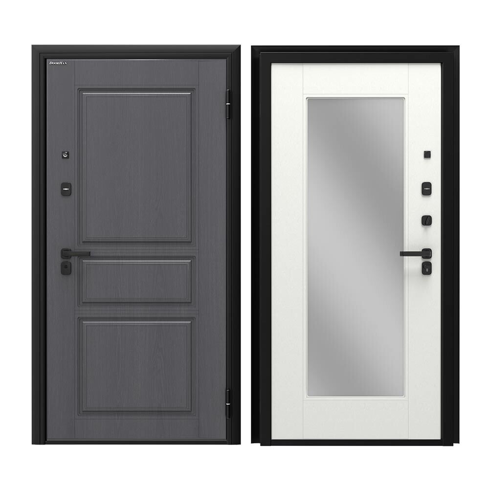 Входная дверь DoorHan Премиум предназначена для покупателей, которые ценят не только технические характеристики, но и привлекательный современный дизайн. Отличительная особенность — дверь полностью изготовлена из холоднокатаной оцинкованной стали толщиной 0,8 мм с использованием технологии бесшовного производства с 2-мя листами металла. В качестве наполнения используется огнестойкая минераловатная плита высокой плотности 130 кг/м3, заполнение полотна беспустотное. Снаружи МДФ панель в цвете Серый Графит с фрезеровкой «Классика», изнутри МДФ панель в белом цвете с зеркалом.