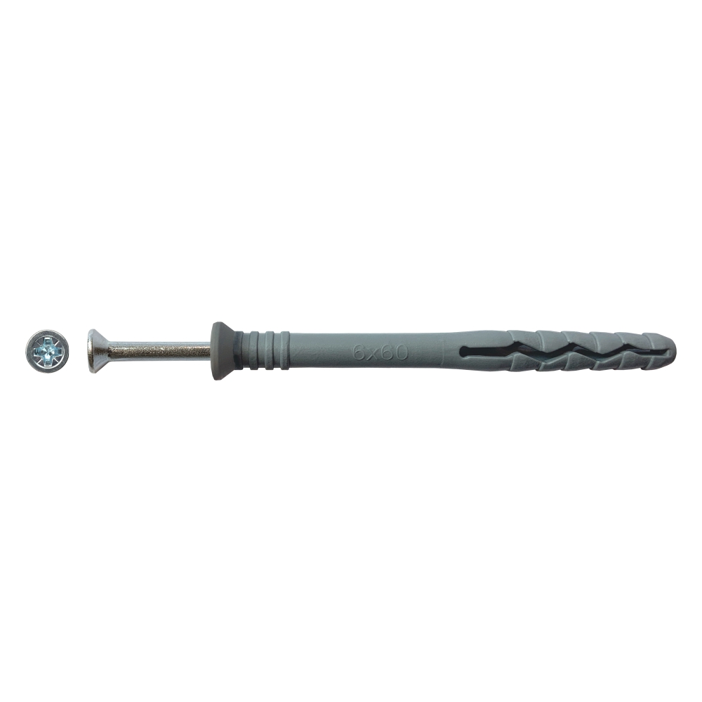 Предназначен для крепления в бетон, керамический полнотелый кирпич, ячеистый бетон, клинкерный кирпич и натуральный камень. Поставляется в комплекте со стальным гвоздеобразный шурупом (крестообразным шлицом), шлиц которого позволяет демонтировать закрепляемую деталь без нарушения внешнего вида крепления.