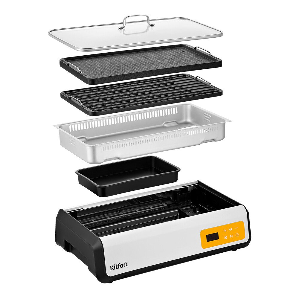 Электрогриль КТ-1686 предназначен для приготовления мяса, рыбы, овощей, сосисок, бутербродов, панини, сэндвичей, гренок, тостов и многих других блюд. На дисплее отображаются температура приготовления и таймер. С помощью сенсорных кнопок вы самостоятельно можете запускать и отключать вентилятор, а также настроить температуру (100, 120, 140, 160, 180, 200, 220, 250°C) и таймер от 20 до 120 минут. Большая площадь поверхности съемных панелей позволяет одновременно жарить много продуктов. У прибора две панели для жарки: с гладкой и ребристой поверхностью. Панель с ребристой поверхностью придает ребристый рисунок и помогает стекать жиру. Вентилятор позволяет удалять из гриля образующийся в процессе готовки дым, что улучшает качество приготовления и препятствует запотеванию крышки.