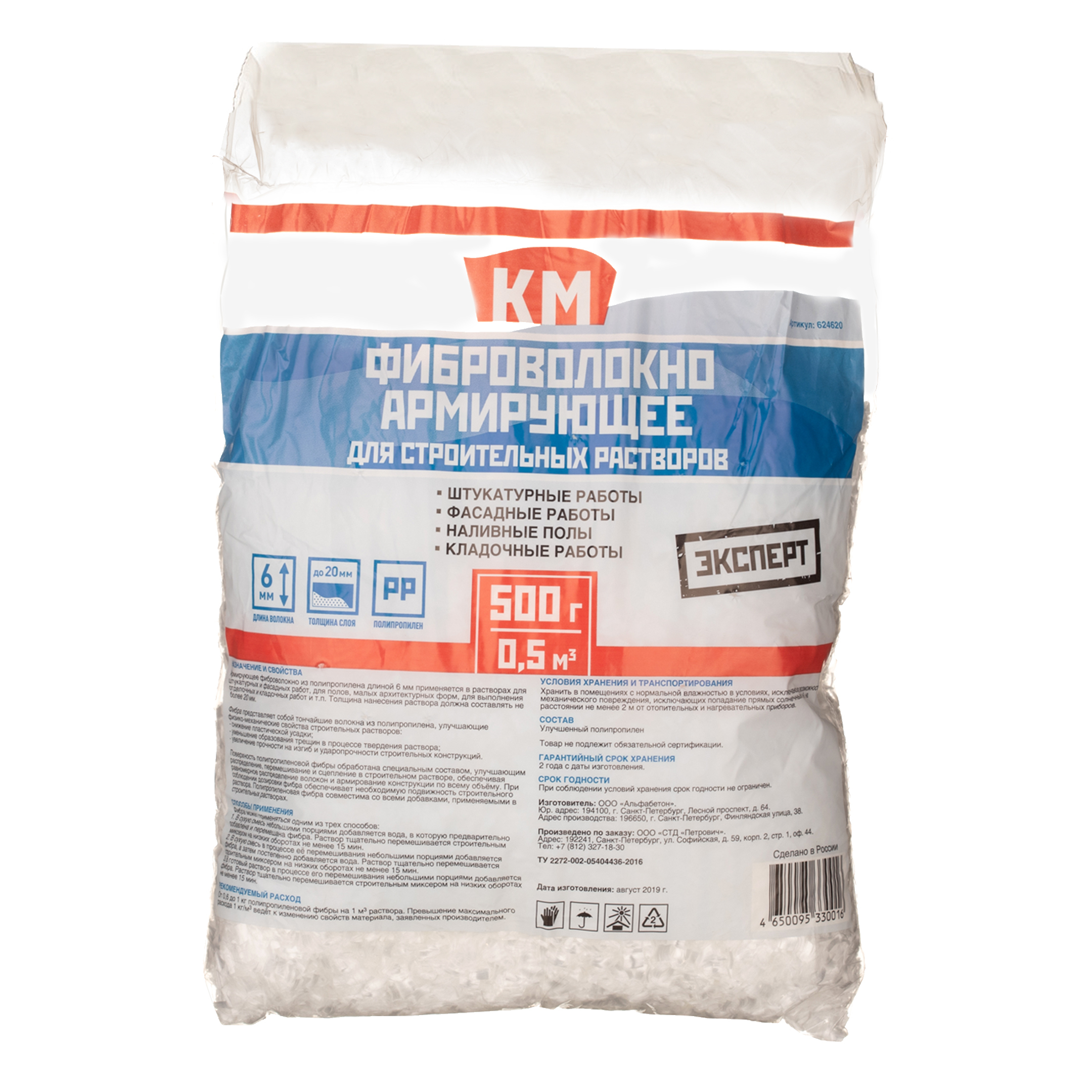 Фиброволокно армирующее для кладочных и штукатурных растворов полипропиленовое КМ Эксперт 0,5 кг
